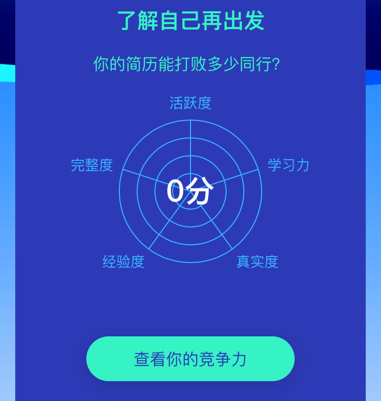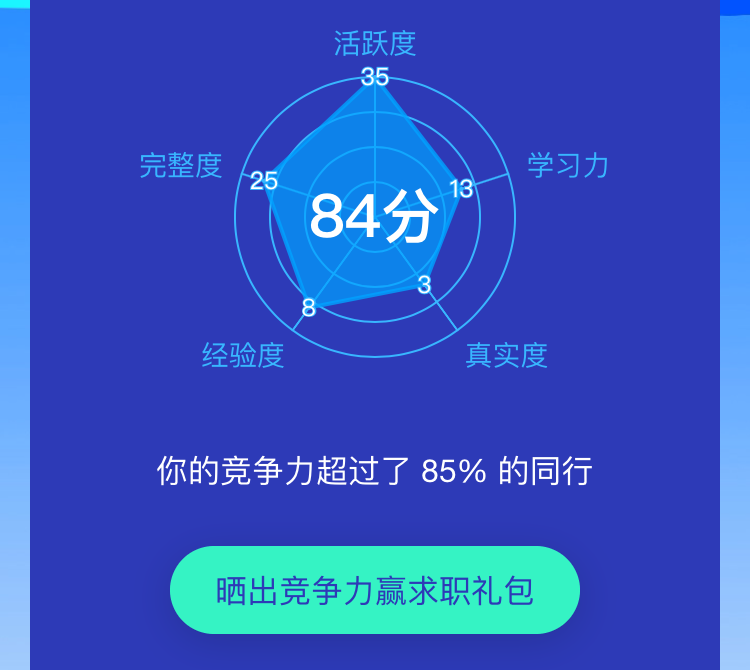 查看個人簡歷競爭力分數(shù) ,點擊曬出我的競爭力贏禮包,并分享到朋友圈;