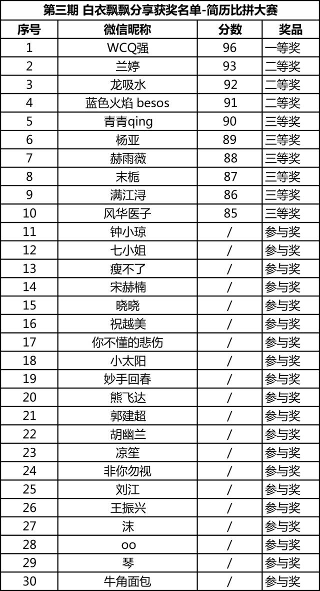 | 第三期 白衣飄飄分享獲獎名單-簡歷比拼大賽 | |||