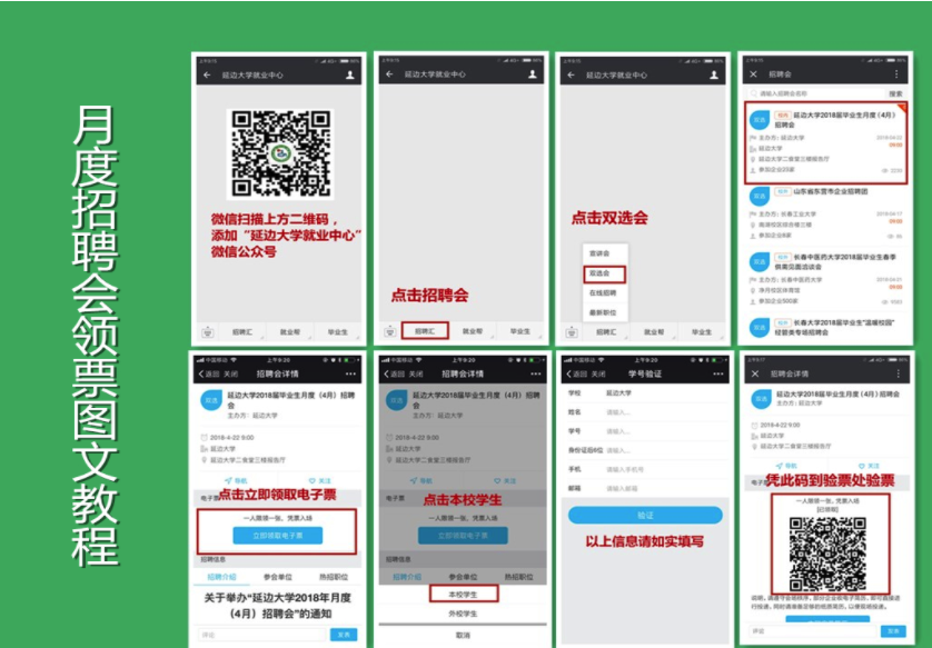 溫馨提示:要求參加招聘會的學生需通過「延邊大學就業(yè)中心微信公眾平臺」,生成參會二維碼,入場需掃碼確認后信息方可進入會場。如有問題,請撥打聯系電話咨詢我們。