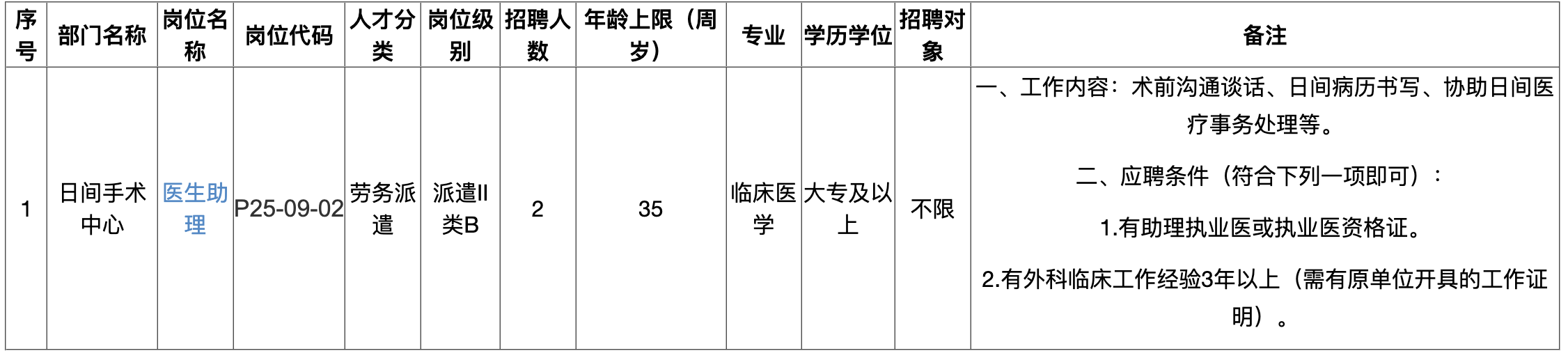 2025年日間手術中心勞務派遣醫(yī)生助理招聘崗位表