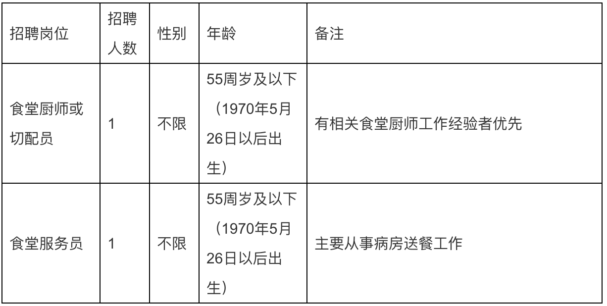 因醫(yī)院業(yè)務(wù)發(fā)展需要,現(xiàn)面向社會(huì)招聘編外人員2名,食堂廚師或切配員1名,食堂服務(wù)員1名。