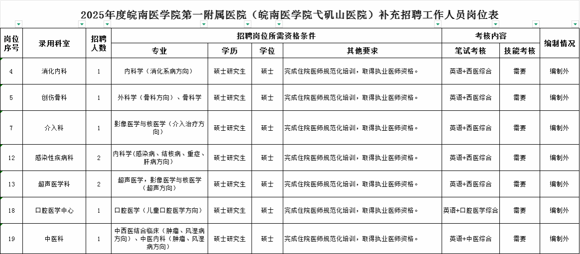 為滿足醫(yī)院發(fā)展需要,結合醫(yī)院工作實際,現(xiàn)將2025年度皖南醫(yī)學院第一附屬醫(yī)院(皖南醫(yī)學院弋磯山醫(yī)院)補充招聘工作人員有關事項公告如下:
