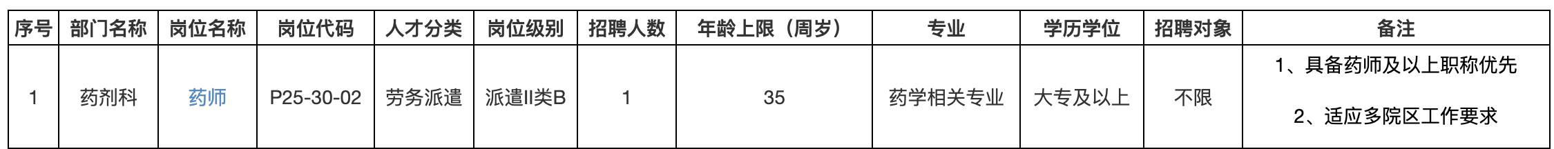因工作需要,本單位擬公開招聘勞務(wù)派遣藥師1名,派遣至浙江大學(xué)醫(yī)學(xué)院附屬兒童醫(yī)院藥劑科。招聘將堅(jiān)持公開、公平、競(jìng)爭(zhēng)、擇優(yōu)的原則,凡符合招聘崗位要求者,請(qǐng)登陸浙江大學(xué)醫(yī)學(xué)院附屬兒童醫(yī)院網(wǎng)上招聘系統(tǒng)https://zhaopin.chzju.cn/進(jìn)入“應(yīng)聘者入口”,請(qǐng)用真實(shí)信息注冊(cè)賬號(hào)、填寫簡(jiǎn)歷、投遞志愿。也可通過搜索“浙大兒院招聘”微信公眾號(hào)填寫簡(jiǎn)歷、提交應(yīng)聘崗位。一般不接受其他方式報(bào)名。每位應(yīng)聘人員限報(bào)一個(gè)崗位,“投遞志愿”以第一志愿為準(zhǔn),其他志愿為備選志愿。僅注冊(cè)、填寫簡(jiǎn)歷,不應(yīng)聘崗位視作報(bào)名無效。請(qǐng)?jiān)凇皞€(gè)人中心”-“投遞記錄”中查看第一志愿崗位為“已投遞”狀態(tài),應(yīng)聘者應(yīng)對(duì)自己所提供資料的真實(shí)性負(fù)責(zé),凡弄虛作假者,取消應(yīng)聘資格。