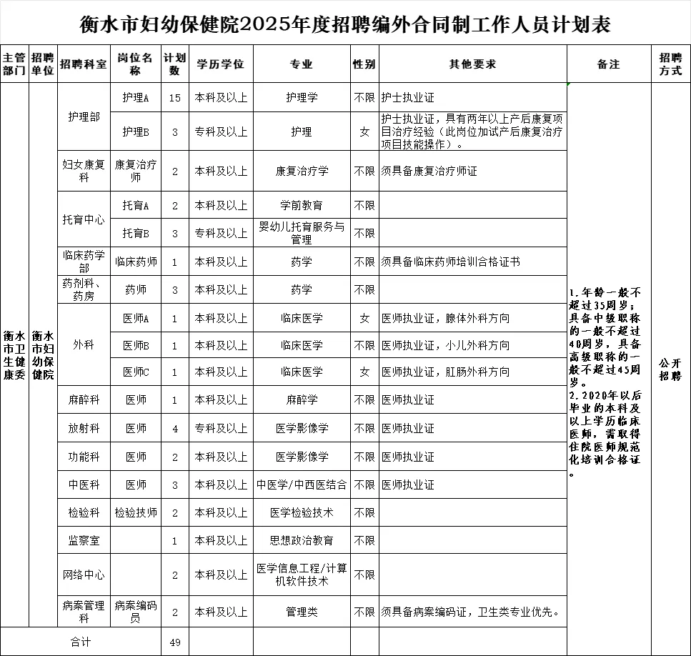 2.崗位有其他要求的以崗位要求為準(zhǔn),詳見(jiàn)附件1:《衡水市婦幼保健院2025年度招聘編外合同制工作人員計(jì)劃表》。