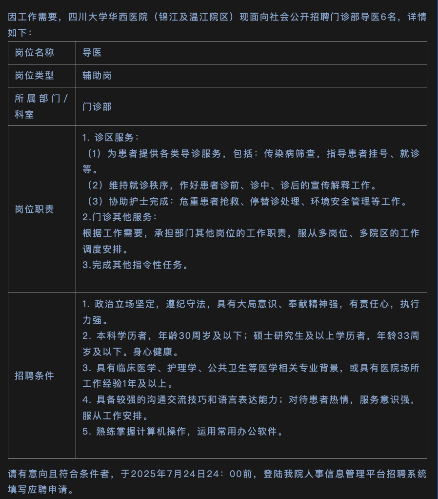 2025四川大學(xué)華西醫(yī)院門診部導(dǎo)醫(yī)招聘6人公告 發(fā)布單位四川大學(xué)華西醫(yī)院工作地點(diǎn)四川成都市武侯區(qū)附件資料查看聯(lián)系方式