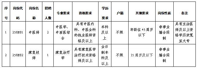 因工作需要,我院擬向社會公開招聘中醫(yī)師2名,康復技師1名,均屬于非事業(yè)編合同制。