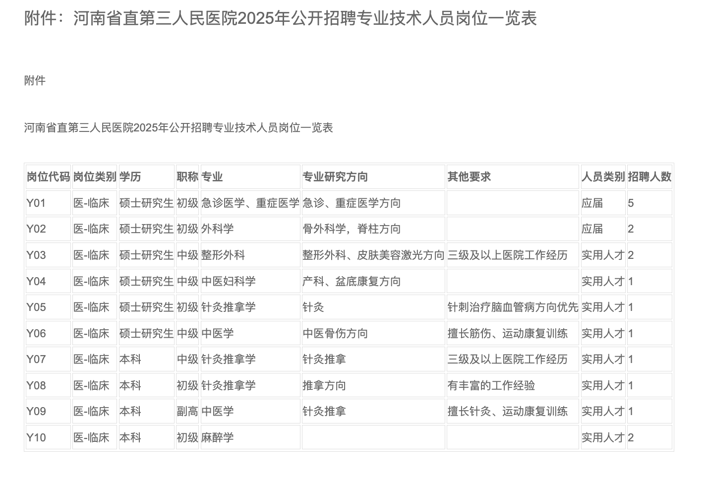根據(jù)我院崗位空缺情況和醫(yī)院發(fā)展需要,公開招聘17名專業(yè)技術(shù)人員。詳見附件《河南省直第三人民醫(yī)院2025年公開招聘專業(yè)技術(shù)人員崗位一覽表》。