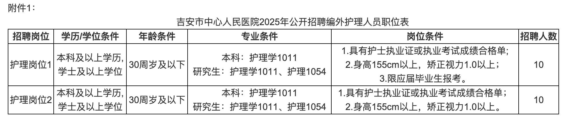 公開招聘吉安市中心人民醫(yī)院編外護(hù)理人員20名,具體崗位詳見《吉安市中心人民醫(yī)院2025年公開招聘編外護(hù)理人員職位表》(附件1)。