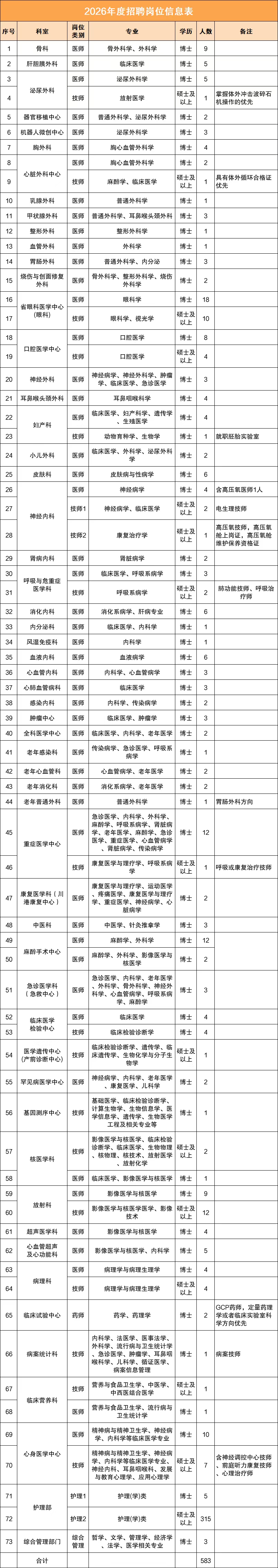 根據(jù)醫(yī)院發(fā)展規(guī)劃,結(jié)合學(xué)科建設(shè)需要,現(xiàn)將 2026 年度招聘公告如下: