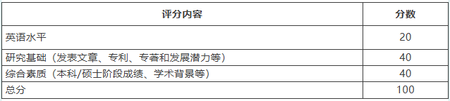 1. 中心初審并確定入圍綜合考核的申請(qǐng)者名單,中心的考核專家小組將根據(jù)申請(qǐng)者所提交的材料對(duì)其申請(qǐng)資格、基本素質(zhì)和科研潛質(zhì)進(jìn)行評(píng)審??己藢<倚〗M對(duì)其材料進(jìn)行評(píng)審并評(píng)分(評(píng)分標(biāo)準(zhǔn)見下方表格),根據(jù)評(píng)分排序和擇優(yōu)推薦原則,按不低于 1:2 的比例確定進(jìn)入綜合考核的考生名單。